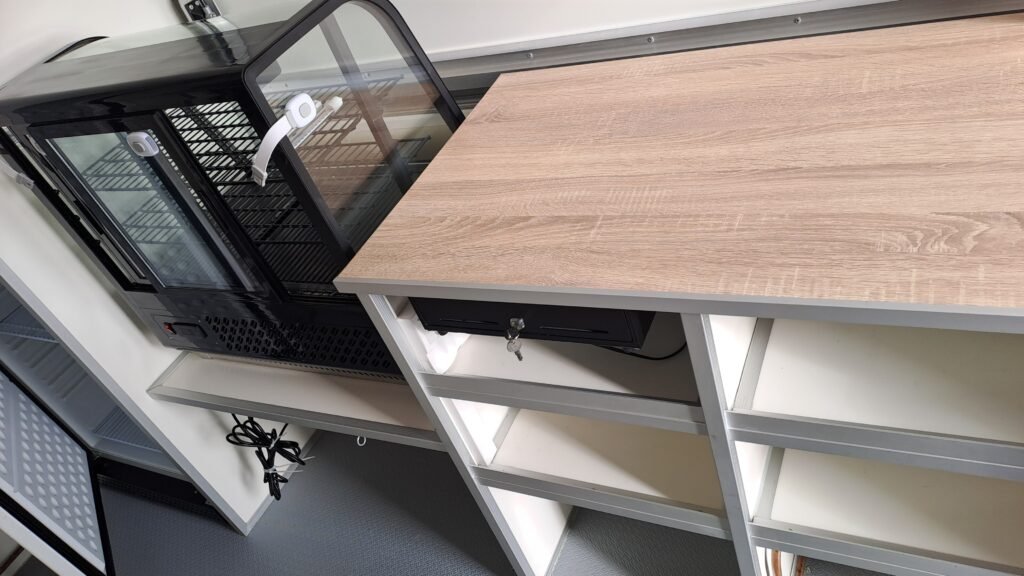tiroir caisse fourni sous plan de travail, espace libre pour votre TPE (TPE non fourni)