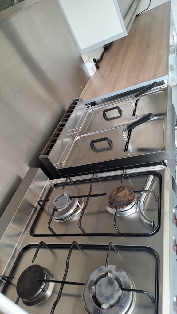 Espace cuisson inox, plan de travail inox, protection thermique inox dessous feuille de néphalyte, hotte aspirante, friteuse et réchaud feux vifs